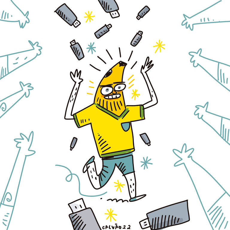 Na ilustração de Galvão Bertazzi temos uma banana representando Eduardo Bolsonaro. Ela veste o uniforme da seleção brasileira e está distribuindo Pen Drives para pessoas aleatórias.