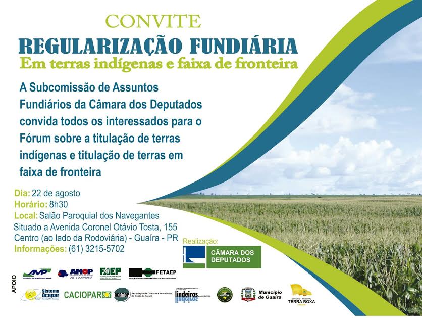 A Subcomissão de Assuntos Fundiários da Câmara dos Deputados realiza no sábado (22), em Guaíra, um fórum sobre titulação de terras indígenas e terras em faixa de fronteira. O município foi escolhido pelo parlamentar por estar em faixa de fronteira e já trabalhar na discussão sobre titulação terras indígenas.