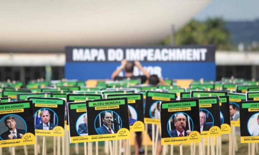 Cartazes com fotos de deputados à favor e contra o impeachment foram expostos em frente ao Congresso Nacional. A foto é de Jorge William na Agência O Globo.