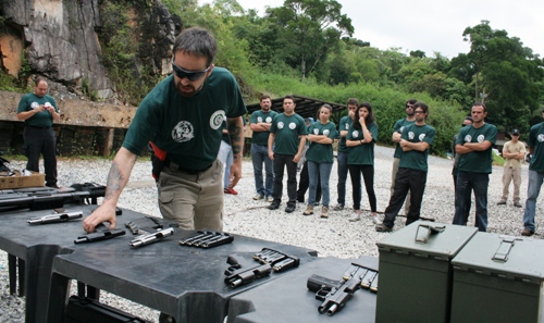 O instrutor Sérgio, da Tess Brazil, dando orientações para a turma da imprensa “aprender” a disparar pistolas e escopeta calibre 12.