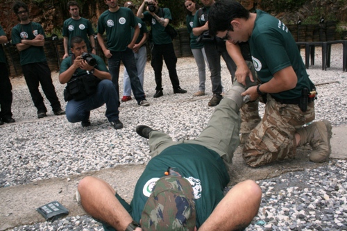 Instrutor da Tess Brazil ensina grupo sobre técnicas de primeiros socorros em ambientes hostis e áreas de confrontos armados.