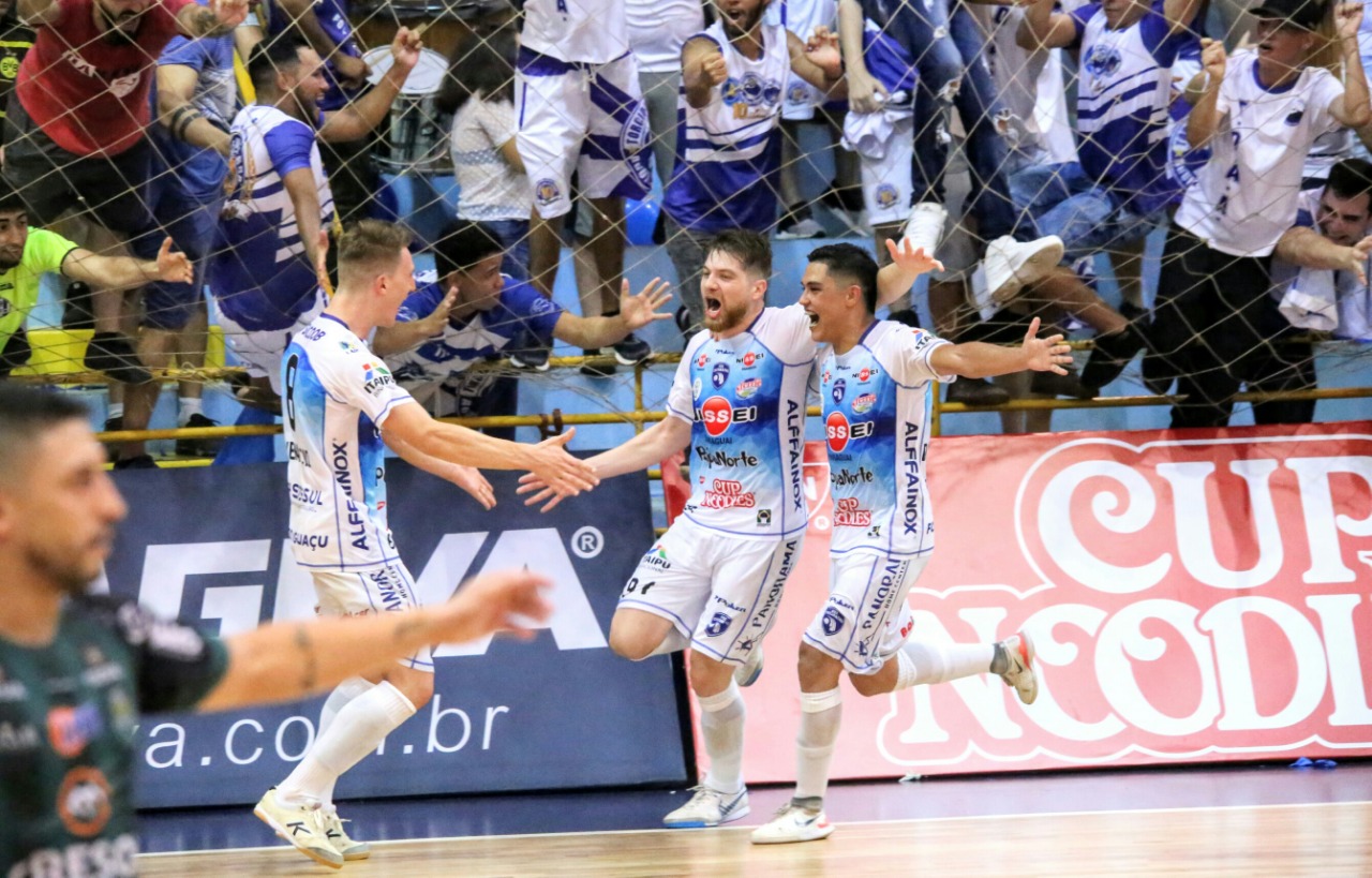 A equipe iguaçuense fez valer o mando de quadra e começou pressionando o adversário e, logo aos 2’39, abriu o placar com Vini. O gol de empate do Marreco não demorou para sair. Aos 3’57, Dener deixou tudo igual. Aos 10’03, Canabarro fez o segundo do Foz, com Vini balançando as redes novamente aos 14’38, ampliando para 3 a 1. Aos 16’27, Emerson diminuiu para o time visitante, mas Rodrigo Trentin fechou o placar no primeiro tempo fazendo 4 a 2, aos 18’38.
