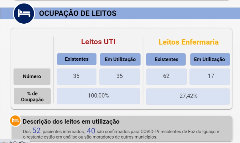 Foz do Iguaçu atingiu 100% dos leitos de UTI disponíveis para covid-19 ocupados, informa o boletim epidemiológico deste domingo, 5. Os 35 leitos no município estão ocupados. Na enfermaria, a ocupação é de 27,42%, ou seja, 17 leitos estão com pacientes em um total de 62 leitos.