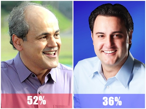 O candidato Gustavo Fruet (PDT) lidera a primeira pesquisa Datafolha para a prefeitura de Curitiba realizada neste segundo turno. Fruet está 16 pontos à frente, com 52% das intenções de voto, enquanto Ratinho Jr (PSC) conta 36%. Brancos e nulos somam 8% e os eleitores que se dizem indecisos são 4%.
