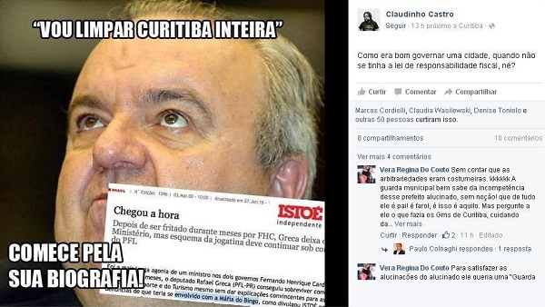 O ator Claudinho Castro, coordenador de redes sociais do prefeito Gustavo Fruet (PDT) e pré-candidato a vereador pelo PV, atacou o ex-prefeito Rafael Greca (PMN) no facebook. Em post desta sexta-feira, 29, Castro questionou a declaração de Greca – “vou limpar Curitiba inteira” – na sabatina da Gazeta do Povo. Ele sugere que o ex-prefeito comece por limpar sua biografia e coloca um print da revista IstoÉ com matéria de 1996, apontando o envolvimento de Greca com máfia do bingo. “Como era bom governar uma cidade, quando não se tinha a lei de responsabilidade fiscal, né?”, questiona Castro. Assessores e comissionados de Fruet curtiram o post.