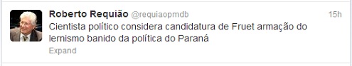 Fruet é uma “armação do lernismo banido do Paraná”, dispara Requião 10/10/2012 do twitter do senador Roberto Requião Compartilhe isso: Clique para compartilhar no Facebook(abre em nova janela) Facebook Clique para compartilhar no X(abre em nova janela) 18+ Clique para compartilhar no WhatsApp(abre em nova janela) WhatsApp Relacionado