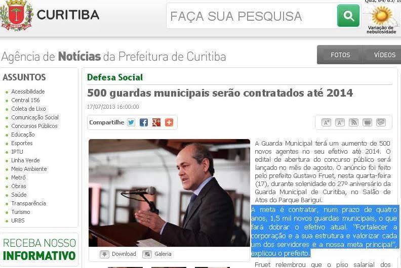 Em campanha se promete de tudo e com o prefeito Gustavo Fruet (PDT) não foi diferente. Nos debates e nos programas eleitorais, Fruet prometeu dobrar o contingente da guarda municipal de Curitiba e recebeu a corporação em 2013 com 1.780 guardas municipais. Pois então, em julho de 2013 lançou um edital de concurso público para contratar 500 novos guardas. Em agosto, a prefeitura fez o concurso e sabem quantos guardas municipais Fruet chamou desde então? Nenhum.