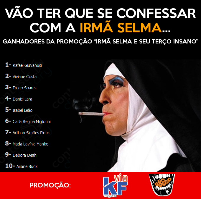 Resultado da promoção “Irmã Selma e Seu Terço Insano”, realizada pelo blog em parceria com a Via KF Viagens. O Boca Maldita entrará em contato com os ganhadores.