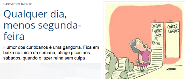 Pesquisa encomendada pela Gazetona descobriu que o curitibano não gosta da segunda-feira e seu dia preferido na semana é o sábado. O próximo levantamento vai revelar que ele prefere colocar açúcar ou adoçante no café – e dispensa o sal. Expressionante!