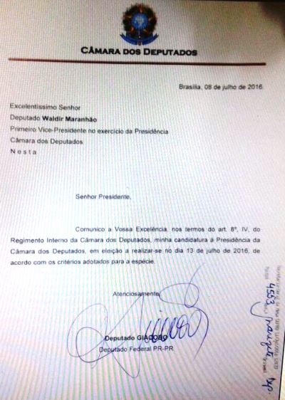 O deputado Fernando Giacobo (PR-PR) oficializou ao presidente interino, Waldir Maranhão (PP-MA), sua candidatura à presidência da Câmara Federal, para um mandato tampão até fevereiro de 2017.