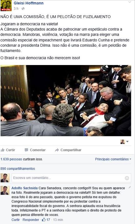 A senadora Gleisi Hoffmann (PT-PR) foi criticada ao postar uma foto que tem o administrador Adolfo Sachsida, um militante anti-petista, quando ele protestava contra o governo e foi retirado do Congresso por seguranças. Gleisi quis dar a ideia de que a foto era desta terça, 8, quando deputados governistas destruíram urnas de votação no plenário numa tentativa grosseira de barrar a votação que elegeu por ampla margem a chapa de oposição para compor a comissão que analisará o pedido de impeachment da presidente Dilma Rousseff (PT). Para Gleisi, a oposição estaria agindo com truculência, quando o que ocorreu foi exatamente o contrário.