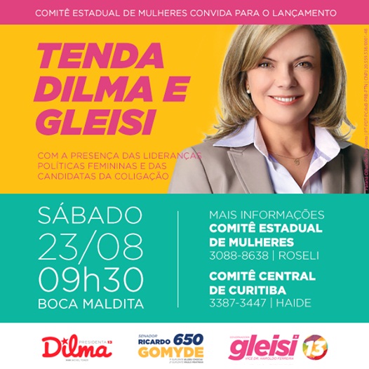 Gleisi Hoffmann (PT) combateu tanto a tenda digital do governador Beto Richa (PSDB), mas resolveu armar a sua “Tenda Dilma e Gleisi” na Boca Maldita de Curitiba. A tenda foi inaugurada pela manhã deste sábado (23), um espaço destinado à militância das mulheres. Também é a primeira vez que Gleisi pede voto para Dilma. No seu programa eleitoral, a atual presidente não aparece. Quem tem vez na TV é o ex-presidente Lula que protagoniza as campanhas petistas (governo e deputados) no Paraná.