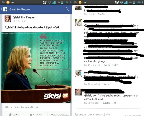A senadora Gleisi Hoffmann (PT) hesitou hoje e fez campanha no Facebook. A petista tinha prometido suspender suas atividades por três dias em respeito ao luto pela morte de Eduardo Campos (PSB). Alertada pelos usuários da rede, Gleisi apagou o post.