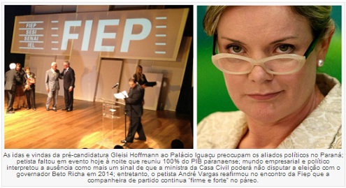 A ausência de Gleisi foi interpretada pelo mundo empresarial ali presente, na sede da entidade, como mais um sinal de que ela não disputará o Palácio Iguaçu com o governador Beto Richa (PSDB).