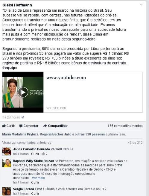 A ministra Gleisi Hoffmann (Casa Civil) postou o vídeo da presidente Dilma sobre o leilão de Libra no seu perfil no Facebook, resolveu patrocinar (pagar) o post para ter mais alcance, mas só sobrou críticas à ministra, ao PT e para Dilma. “Vergonha mais um roubo programado, para encher os bolsos dos políticos corruptos, acorda Brasil, quando vamos nos tornar uma verdadeira nação que luta pelos seus direitos”, comentou Ademar Souza.