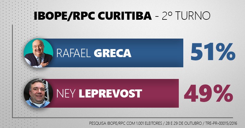 A última pesquisa Ibope antes do segundo turno aponta para uma virada na intenção de voto na disputa da prefeitura de Curitiba. Rafael Greca (PMN) tem 51% dos votos válidos e Ney Leprevost (PSD) aparece com 49%. Em relação à pesquisa anterior, divulgada no dia 21, Leprevost caiu 4 pontos (tinha 53% dos votos válidos), enquanto Greca subiu quatro pontos (tinha 47%).