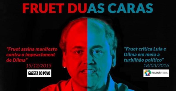 Em 2012, o então ex-tucano e o terceiro colocado nas eleições de 2010 como senador no Paraná, Fruet andou de braços dados pelos palanques e pelas ruas com a então recém eleita senadora Gleisi Hoffmann (PT) e outros petistas de porte e hoje presos na Lava Jato, como o ex-presidente estadual do PT, André Vargas, o ex-presidente Lula e a própria presidente Dilma Rousseff que estava junto com sua foto os cavaletes pelas calçadas da capital. Sua vice é a advogada petista Mirian Gonçalves, desafeta de Gleisi dentro do partido – A Rainha do Petrolão e hoje alvo da Operação Lava Jato em duas frentes e também “prestigiada” em delação do senador Delcídio Amaral (Sem partido/MS).