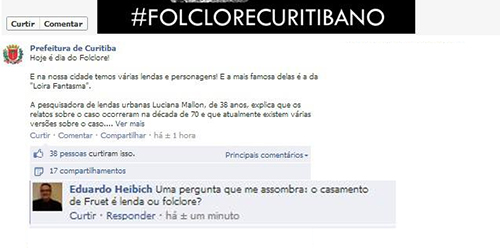 Ontem foi dia do folclore. Pois bem, o perfil da prefeitura de Curitiba no Facebook comemora o dia em postagens lembrando causos, lendas e histórias do folclore curitibano. Isso até um gaiato fazer o seguinte comentário: uma pergunta que me assombra: o casamento de Fruet é lenda ou folclore? O comentário, óbvio, foi apagado, mas sobrou tempo para ser printado e espalhado na internet.