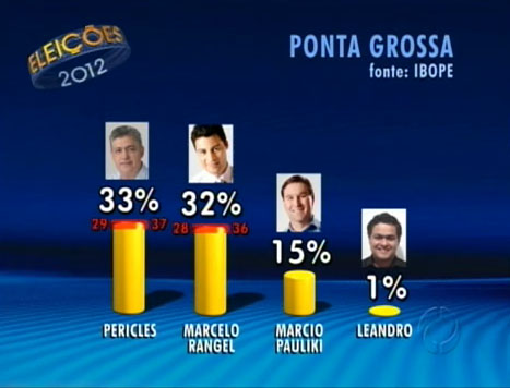 Pesquisa Ibope mostra empate técnico entre os deputados Péricles Mello (PT) e Marcelo Rangel na disputa da prefeitura de Ponta Grossa. Péricles (33%), Rangel (32%) e Marcio Paulik, do PDT, com 15% são os três primeiros colocados na consulta. Se mantiver a tendência até 7 de outubro, os dois vão para a disputa do segundo turno.