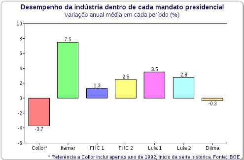 Com isso, o crescimento médio do setor ao longo dos oito anos de governo do ex-presidente Luiz Inácio Lula da Silva foi de 3,2% ao ano. Nos dois mandatos do período Fernando Henrique Cardoso, a alta anual foi de 1,9%. Nos dois anos de Itamar Franco, a indústria cresceu 7,5% ao ano.