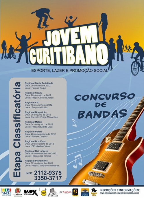 A Secretaria Municipal do Esporte, Lazer e Juventude, em parceria com a empresa Raio X Música, abriu as inscrições para o 1º Concurso de Bandas Jovem Curitibano. Poderão participar bandas de Curitiba que tenham músicas próprias e pelo menos dois dos seus integrantes com idade de 15 a 29 anos. Cada banda deverá ter no mínimo três integrantes.