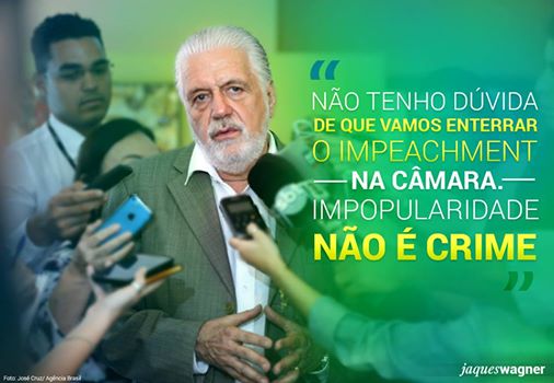 O ministro da Casa Civil, Jaques Wagner, disse nesta segunda-feira que o processo de impeachment deflagrado no início do mês passado contra a presidente Dilma Rousseff será derrubado ainda na Câmara dos Deputados. Ele usou as redes sociais para afirmar que o governo obterá mais que os 171 votos necessários para encerrar o processo. O ministro citou a decisão do Supremo Tribunal Federal (STF), que anulou a sessão que escolheu membros para a comissão do impeachment na Câmara e decidiu que, caso o processo seja aprovado na Câmara, o Senado tem o poder de derrubá-lo. Wagner disse ainda que a impopularidade de Dilma não é crime e portanto não pode ser usada como objeto para embasar o impeachment. As informações são d’O Globo.
