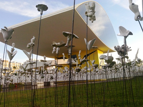 Quem passou agora a tarde em frente ao Museu Oscar Niemeyer, o MON, no Centro Cívico de Curitiba, acabou surpreendido com um jardim de flores de porcelana, em um dos gramados laterais da estrutura.