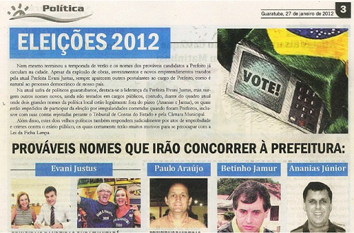 Um possível quadro eleitoral de 2012 é mostrado no mesmo dia no “Jornal de Guaratuba”. Em reportagem publicada na página 3 com a retranca “Eleições 2012”, o jornal cita os “prováveis nomes que irão concorrer à prefeitura”: Evani Justus (PSDB), Paulo Araújo (PSC), Betinho Jamur (PPS) e Ananias Júnior (PMDB), este filho do ex-prefeito.