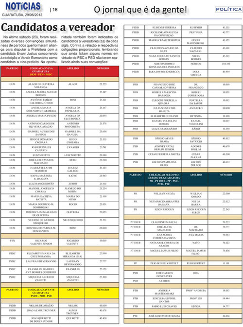O jornal “Notícias”, de Guaratuba, publicou nesta sexta-feira (29) a primeira relação de candidatos a vereador. De acordo com o jornal, os partidos que apoiam a reeleição da prefeita Evani Justus (PSDB) já lançaram três coligações proporcionais.
