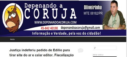 O juiz Marco Antonio de Souza Lima indeferiu o pedido do vereador Edilio Dall’Agnol, presidente a Câmara de Vereadores de Foz do Iguaçu, que tentava liminar para proibir o blog Depenando a Coruja, do Oliveirinha, de fazer qualquer menção ao dito vereador.