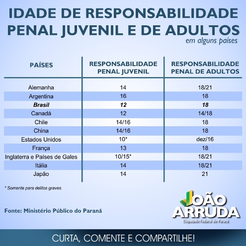 O levantamento, feito com base em levantamentos da UNICEF, revela que o Brasil, com a idade de 12 anos para Responsabilidade Penal Juvenil e de 18 anos Responsabilidade Penal de Adultos, está muito próximo da legislação da maioria dos países.