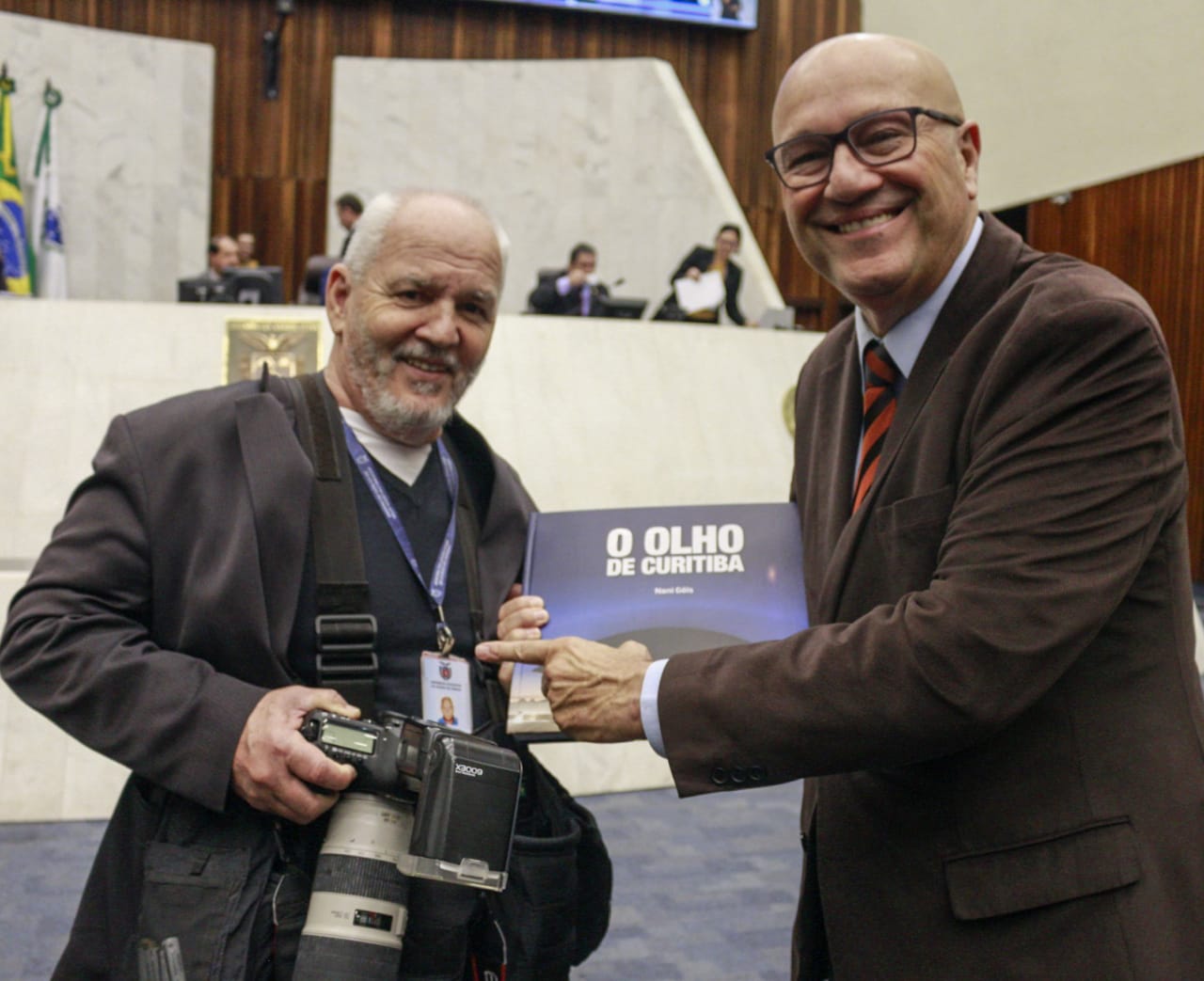O deputado Romanelli (PSB) recebeu das mãos do repórter fotográfico Nani Góis o livro “O Olho de Curitiba, retrato dos 185 dias de construção do Museu Oscar Niemeyer (MON)”. A entrega foi feita durante a sessão nesta quarta-feira (25) na Assembleia Legislativa.