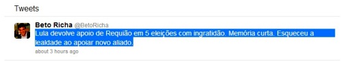 do governador Beto Richa (PSDB), no Twitter, ao comentar o pedido de desculpas públicas de Lula para Osmar Dias (PDT) por ter apoiado Roberto Requião (PMDB) nas eleições de 2006. Lula se disse arrependido pelo apoio ao peemedebista que disputou, e venceu, a eleição ao Governo do Paraná contra Osmar Dias.