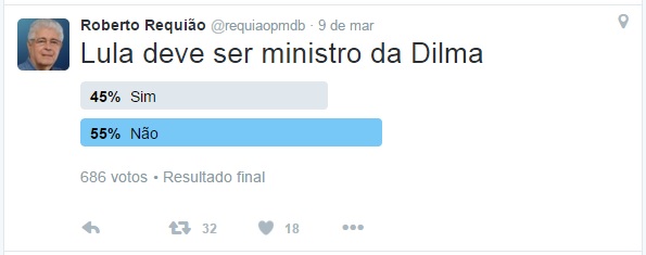 É o que aponta enquete promovida pelo senador Roberto Requião (PMDB-PR), em seu perfil no Twitter. Dos 686 participantes, 55% disseram que ele não deve ser e 45% que sim. Vejam:
