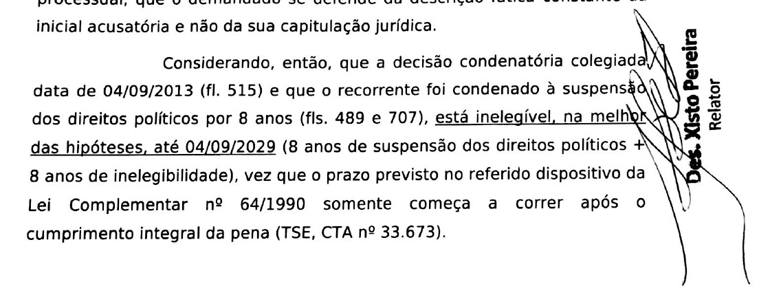 “Considerando a existência de uma decisão condenatória colegiada de 04/09/2013 e que o recorrente (Mac Donald) foi condenado à suspensão dos direitos políticos por 8 anos, está inelegível, na melhor das hipóteses, até 04/09/2029″, relatou o desembargador Xisto Pereira, ao indeferir o recurso de Mac Donald, contra decisão do juiz da 46ª Zona Eleitoral, Marcos Antonio Fazon, impugnando seu pedido de candidatura à prefeito de Foz do Iguaçu.