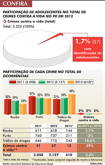Em 2011 o panorama não era diferente. Segundo os números, de um total de 2.058 ocorrências envolvendo jovens entre 12 e 18 anos, no Paraná, os crimes contra a vida representaram apenas 2%. A maior participação foram os casos de furto (37%), seguidos por tráfico (31%) e roubos (30%).