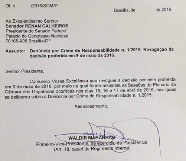 “Revogo a decisão por mim proferida em 9 de maio de 2016, por meio da qual foram anuladas as sessões do plenário da Câmara dos Deputados ocorridas nos dias 15, 16 e 17 de abril de 2016, nas quais se deliberou sobre denúncia por crime de responsabilidade número 1 de 2015”, diz o texto de sua decisão.