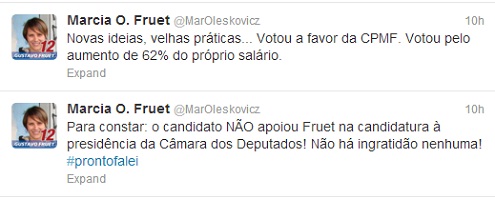 No Twitter, Márcia Fruet fuzila Ratinho Jr. “Novas ideias, velhas práticas…” 03/10/2012 do Twitter de Márcia Fruet, esposa de Gustavo Fruet (PDT), que disputa a prefeitura de Curitiba contra Ratinho Junior (PSC): Compartilhe isso: Clique para compartilhar no Facebook(abre em nova janela) Facebook Clique para compartilhar no X(abre em nova janela) 18+ Clique para compartilhar no WhatsApp(abre em nova janela) WhatsApp Relacionado
