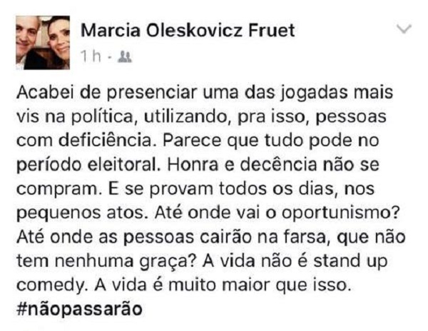 Assim como já culpou os higienistas pela proliferação, morte e agressões aos moradores de ruas, a primeira dama do município, Márcia Fruet, agora vê jogada política no acidente que o humorista Fagner Zadra sofreu devido às más condições das calçadas de Curitiba. Márcia é mulher e voz do prefeito Gustavo Fruet (PDT) que se omite em toda e qualquer situação em que a prefeitura é criticada por sua falta de ação em problemas básicos como garantir a acessibilidade à pessoas com deficiência nas calçadas. Márcia Fruet ataca quem é solidário a Zadra, chama de farsa o acidente e zomba do humorista, um cadeirante, ao sugerir que “a vida não é um stand up comedy”.