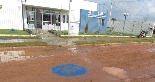 A rua principal do CMEI não é asfaltada e, segundo os moradores, há grande dificuldade em levar ou buscar as crianças em dias de chuva. “Pais e alunos sofrem com buracos, poças de lamas e muito barro, além de não existir calçadas, o mato toma conta de toda vizinhança. O CMEI fica completamente ilhado”, diz o instrutor.