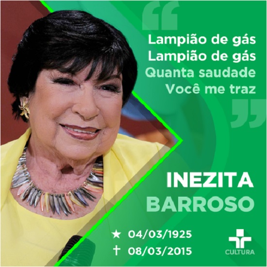 Morreu na noite deste domingo (8), a cantora e apresentadora do Viola, Minha Viola, Inezita Barroso, reconhecida como a mais antiga e mais importante expressão artística da música caipira no País. No último dia 4, havia completado 90 anos de vida. Ela deu entrada no Hospital Sírio Libanês, em São Paulo, em 19 de fevereiro.