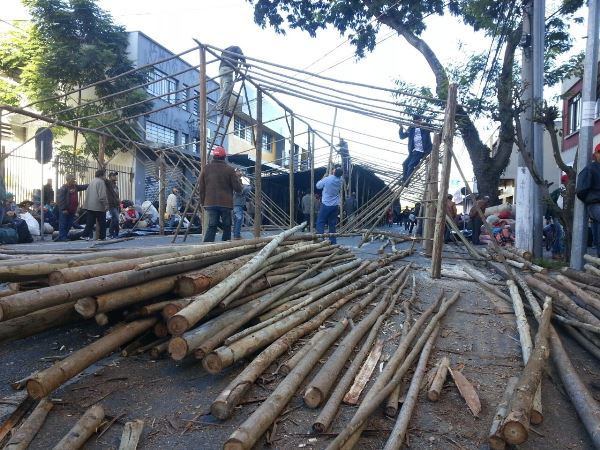 São cerca de dez banheiros químicos e uma gigantesca estrutura de toras e lonas que serve de abrigo. Para organizar tudo isso, o movimento faz uma complexa divisão de tarefas.