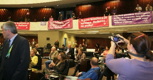Muitas mulheres estão na Assembleia defendendo suas propostas com faixas e cartazes