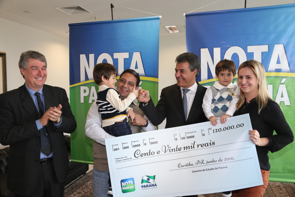 Os ganhadores dos três principais prêmios do sétimo sorteio do programa Nota Paraná moram no interior e vão usar o dinheiro para a casa própria da família. Eles receberam os prêmios do governador Beto Richa nesta sexta-feira, 17, em Curitiba. “Os números mostram a conscientização da população em colocar o CPF na nota fiscal, mostrando que é um programa sério, que traz muitos benefícios, que premia o consumidor, inibe a concorrência desleal no comércio e reduz a carga tributária individual, já que parte do que é gasto retorna para o contribuinte por meio de crédito”, disse Richa sobre a adesão ao programa que até agora, entre prêmios e créditos, já disponibilizou R$ 178,6 milhões aos participantes.
