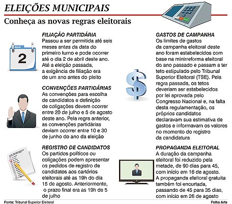 Para quem quer tentar um cargo a prefeito ou vereador, os prazos para filiação a um partido foram reduzidos de 12 para seis meses antes do pleito. Os prazos para convenções partidárias também ficaram mais próximos da data da eleição, devendo ser realizadas de 20 de julho a 5 de agosto deste ano, e o registro dos candidatos pelas legendas ou coligações foi prorrogado até 15 de agosto – antes, era 5 de julho.