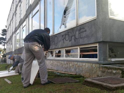 Na foto acima, funcionários trabalham para fechar os buracos onde os vidros da prefeitura de Curitiba foram quebrados. Veja o álbum de fotos no Faceboca