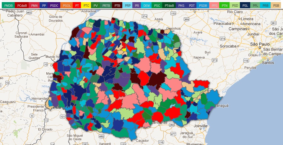O portal G1 disponibiliza um mapa onde é possível como ficou o “retalho político” no Paraná. Com um mapa colorido, ele mostrar as cidades onde cada partido irá governar. Para ampliar, clique na foto.