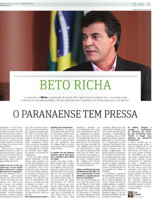 Finalizados os dois primeiros anos de mandato, o governador do Estado, Beto Richa, faz um balanço positivo dos resultados conquistados até aqui, fala do que planeja para 2013 e adianta que vai realizar algumas mudanças na equipe para buscar uma ‘sintonia fina’. Richa diz que a Copa do Mundo deixará um bom le gado para Curitiba e defende o uso do potencial construtivo como a maneira encon trada para cidade sediar os jogos do Mundial 2014.
