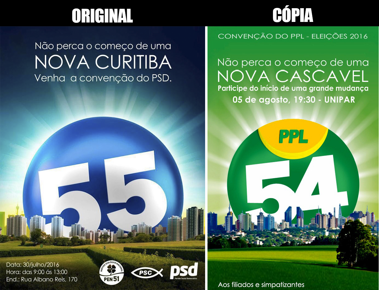 A equipe do candidato Marcio Pacheco (PPL) plagiou material de pré-campanha usado pelos candidatos Ney Leprevost (PSD) em Curitiba e Paranhos (PSC) em Cascavel. A arte copiada teve o conceito desenvolvido pelo marqueteiro Jorge Gerez, que fez a campanha do PSC nacional em 2014 e é responsável pelas campanhas de Ney e Paranhos. O plágio grosseiro absorveu não apenas o conceito da arte, mas cores e até o slogan utilizados nas pré-campanhas de Ney e Paranhos.