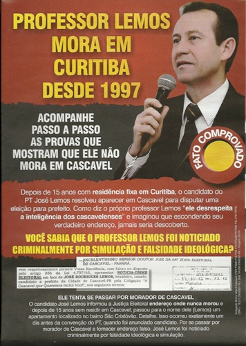 Para PDT, Professor Lemos é forasteiro em Cascavel 25/10/2012 O PDT, de Edgar Bueno, insiste que o Professor Lemos (PT) é forasteiro em Cascavel. Veja o panfleto distribuído por lá. Compartilhe isso: Clique para compartilhar no Facebook(abre em nova janela) Facebook Clique para compartilhar no X(abre em nova janela) 18+ Clique para compartilhar no WhatsApp(abre em nova janela) WhatsApp Relacionado